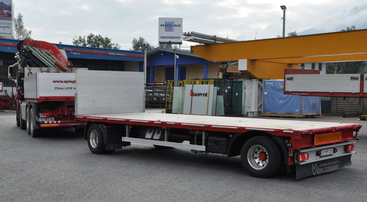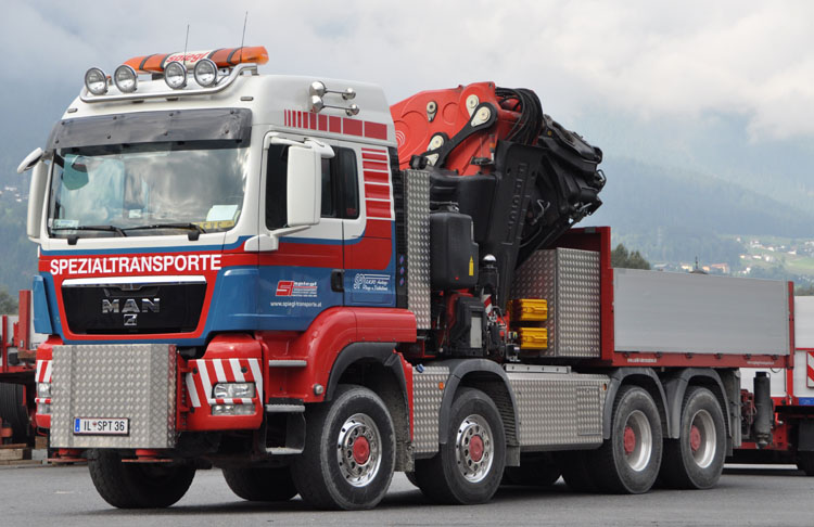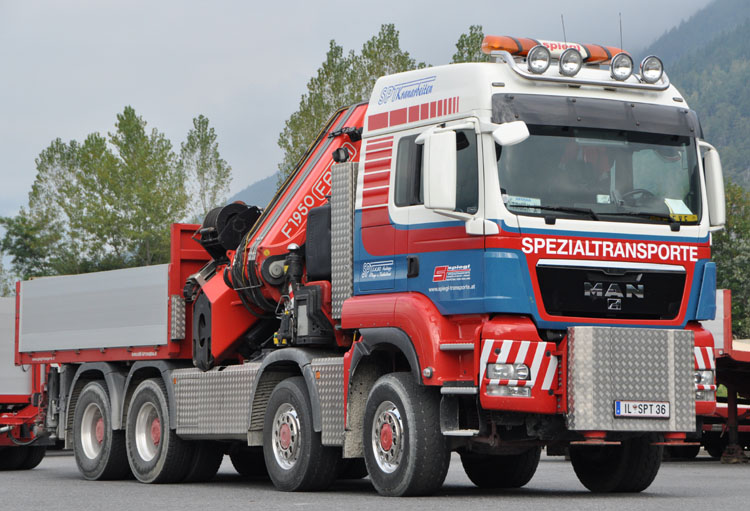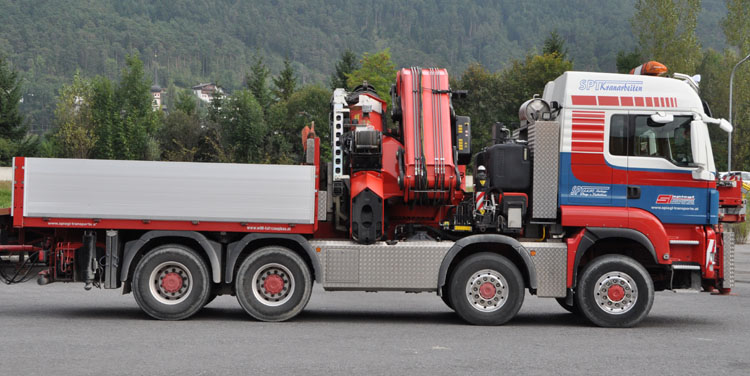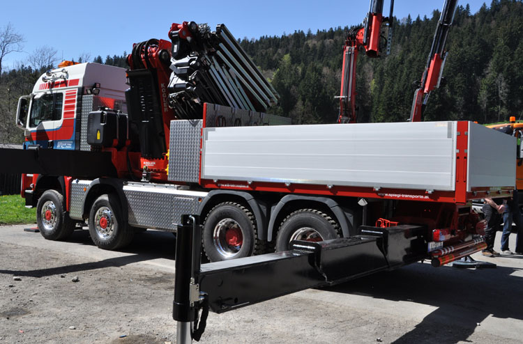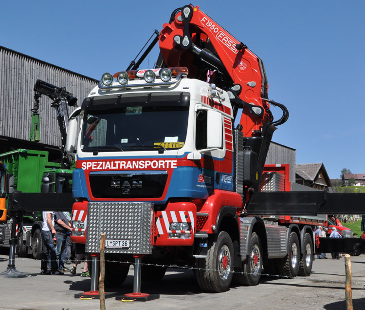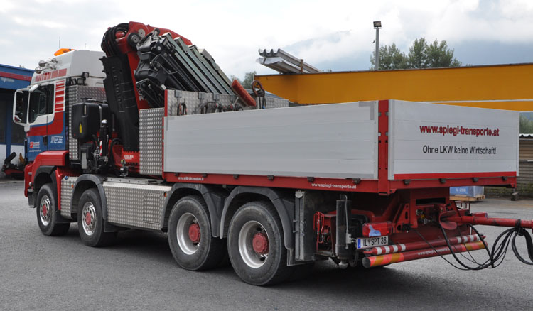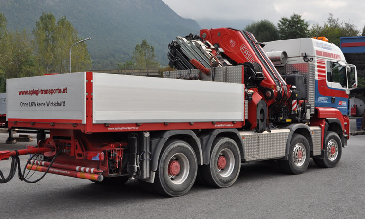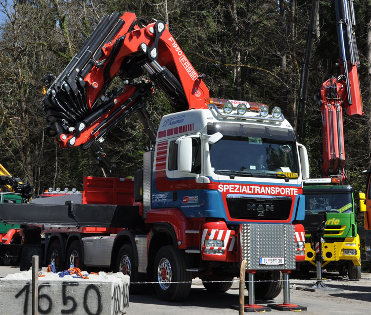 | In 2012 I saw this new crane truck of Spiegl from Pettnau (A) for the first time. Here it was on display at the exhibition of Egon Willi Fahrzeugbau, where it was built. |