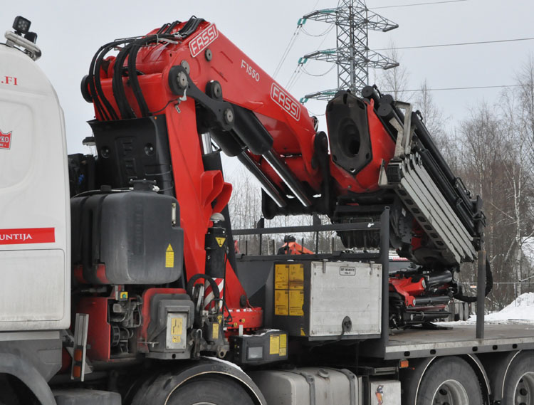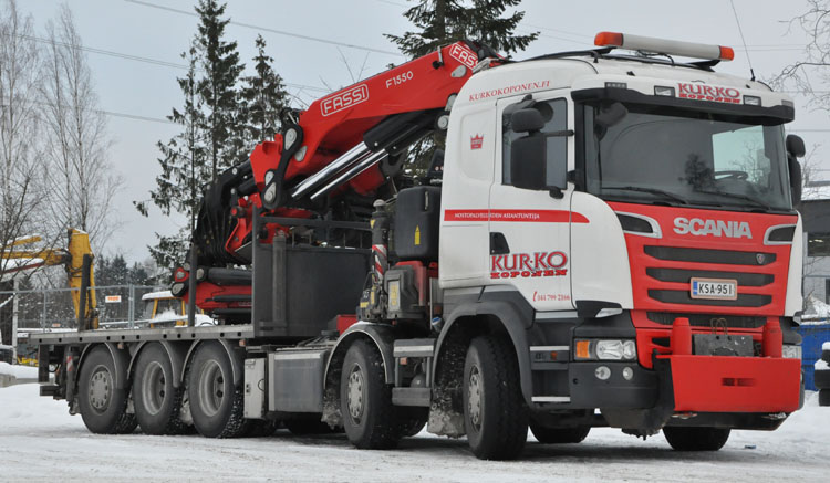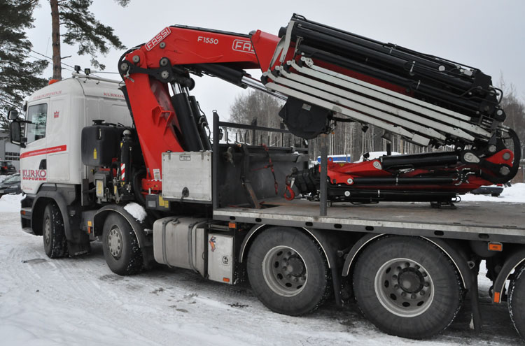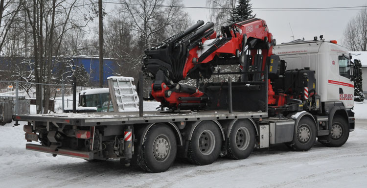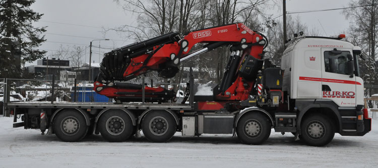 | The finish company Kurko Koponen Oy has extended it's fleet of knuckleboom cranes significantly over the last years. The fleet mainly contains of Fassi cranes. They use the name Kurko Crane to also build these crane trucks for other customers. Here we see a Scania R520 V8 10x4 with Fassi 1550 of them. At the last Bauma a similar truck with a Fassi 2150 could be seen. |
