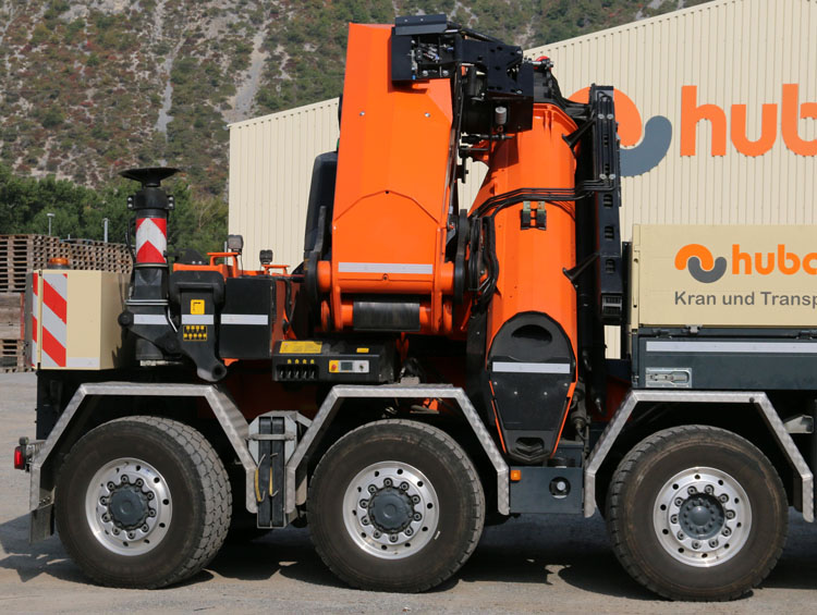 Der Kran wurde weit nach hinten installiert. Diese Platz wurde sorgfältig ausgewählt, damit sowohl der Gewichtsverteilung gut passt, der Kran nach hinten genügend Kapazität hat und beim zusammenfalten genau zwischen die 3. und 4. Achse passt. |