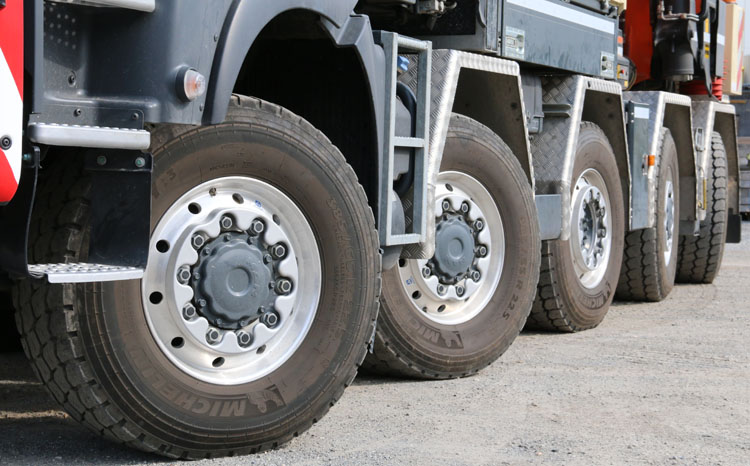 Die 5 lenkende Achsen stehen hier in der Lenkmodus für den engsten Wendekreis. Im Straßenprogramm für höhere Geschwindigkeiten werden die hintere Achsen nicht mehr gelenkt für mehr Stabilität. Als erste zentriert die 4. Achse, danach dann abhänging von die Geschwindigkeit auch die 5. Achse. Mit ein weitere Modus wird verhindert dass das Heck nicht ausschwenkt, z.B. sehr hilfreich beim wegfahren von Wände. |